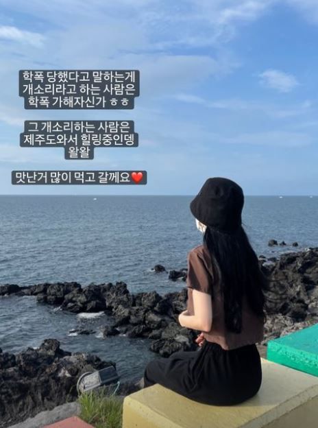 4일 유깻잎은 자신의 인스타그램 스토리에 “학폭 당했다고 말하는 게 개소리라고 하는 사람은 학폭 가해자신가. 그 개소리하는 사람은 제주도 와서 힐링 중인데 왈왈. 맛난 거 많이 먹고 갈게요”라는 글을 남겼다.