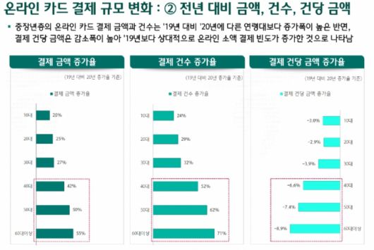 보고서에 따르면 지난해 5060 세대의 온라인 결제 금액은 53% 늘었다. 30대 이하 연령층에서 온라인 결제는 2019년 대비 24% 증가했지만, 40대 이상 중장년층에선 49% 증가했다. 특히 40대 이상이 쿠팡·11번가 등 종합 쇼핑몰에서 결제한 규모의 증가율은 30대 이하 보다 약 1.8배 이상 높았다.