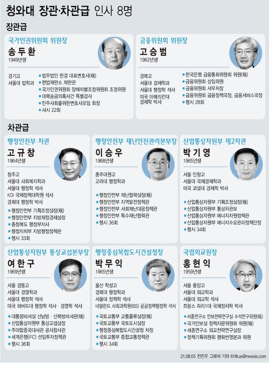 박수현 청와대 국민소통수석은 이날 문 대통령의 차관급 인사에 대한 세부 사항도 전했다. 먼저 행안부 차관에 내정된 고규창 기획조정실장은 행정고시 33회로 공직에 입문한 뒤 지방행정정책관, 충북 행정부지사, 행안부 지방재정경제실장 등을 거쳐 현재 기조실장으로 일하고 있다.
