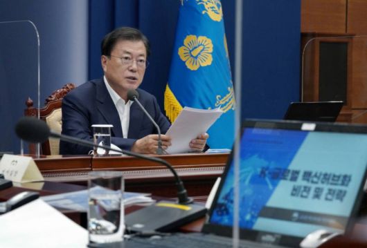 문 대통령은 이날 오후 청와대 여민관에서 화상으로 'K-글로벌 백신 허브화 비전 및 전략 보고대회'를 주재하고 "2025년까지 '글로벌 백신 생산 5대 강국'으로 도약하겠다"며 이같이 말했다.