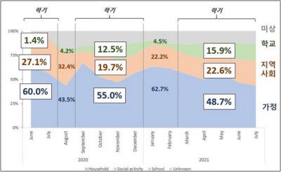 2020년 6월에서 2021년 7월 사이 학생 감염경로 분율. 교육부 제공 |