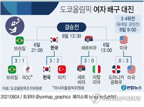 한국 여자배구는 6일 오후 9시 일본 도쿄 아리아케 아레나에서 브라질과 2020 도쿄올림픽 준결승전을 치른다.