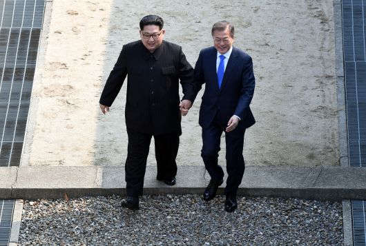 2018년 4월 27일 판문점 남북정상회담시 문재인 대통령과 김정은 북한 국무위원장이 판문점에서 만나 인사를 나눈후 함께 걸어내려오고 있다./한국공동사진기자단 |