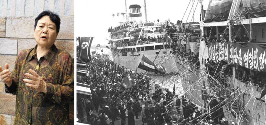 사진 왼쪽은 43년 만에 북한에서 일본으로 돌아와 김정은 정권을 상대로 소송을 제기한 가와사키 에이코(76)씨. 오른쪽 사진은 1959년 일본 니가타항에서 재일동포를 태운 북송선이 출항하는 모습. 가와사키씨도 이듬해인 1960년 같은 배를 타고 북으로 향했다. |