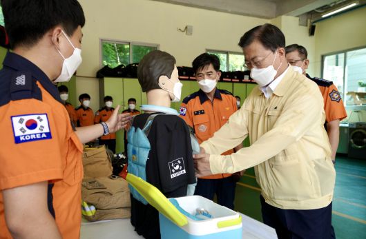 청와대는 이례적 무더위에 코로나19 사태까지 겹치며 소방대원들의 어려움이 커졌다는 점을 고려해 이날 일정을 준비했다고 설명했다.