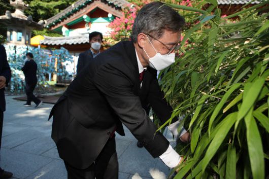 국민의힘 대권주자인 최재형 전 감사원장이 7일 대구 팔공산 동화사를 방문해 경내를 살펴보고 있다. (사진=연합뉴스) |