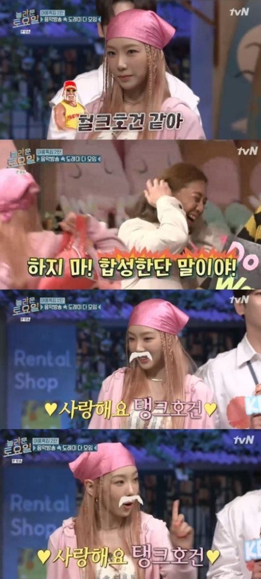 태연은 자신의 신곡 콘셉트에 맞춰 핑크색 두건을 쓰고 나타났다. 하지만 넉살은 태연을 보자마자 "두건이 멋있는데 헐크 호건 같다"고 말했다. 이에 발끈한 태연은 "하지마라"며 "합성한단말이야"라고 말해 웃음을 자아냈다.