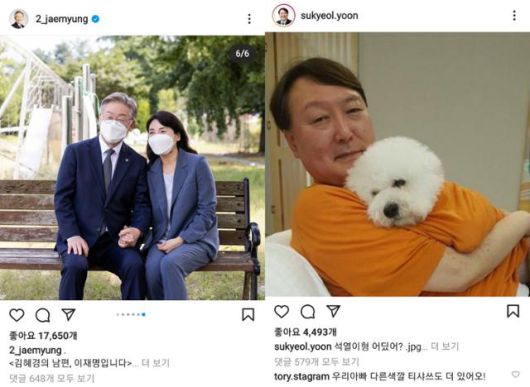 이재명(왼쪽 사진) 경기지사가 7일 인스타그램에 부인 김혜경씨와 손을 잡고 있는 모습을 공개했다. 윤석열 전 검찰총장은 4일 인스타그램에 반려견과 함께 휴가를 즐기는 사진을 올렸다. 두 예비 후보 인스타그램 캡처 |