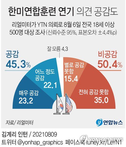 리얼미터가 YTN 의뢰로 지난 6일 전국 18세 이상 500명을 대상으로 조사한 결과, '한미연합훈련 연기 주장에 공감하지 않는다'는 응답이 50.4%로 나타났다.