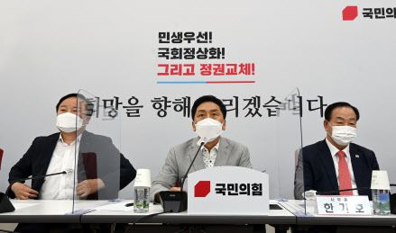 김기현 국민의힘 원내대표(가운대)가 9일 오전 서울 여의도 국회에서 열린 최고위원 간담회에서 발언하고 있다.(사진=연합뉴스) |