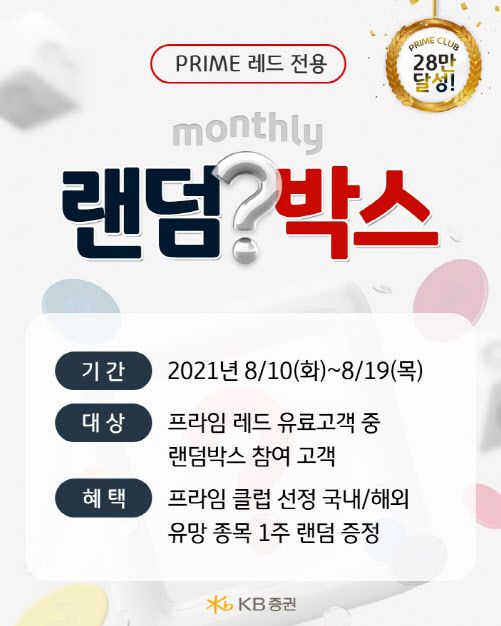 [이데일리 김겨레 기자] KB증권은 올해 말까지 유료 구독경제 서비스 ‘프라임 클럽 레드’ 고객 가운데 랜덤 박스 참여 고객을 대상으로 국내·해외 주식 1종목을 증정하는 이벤트를 진행한다고 9일 밝혔다.