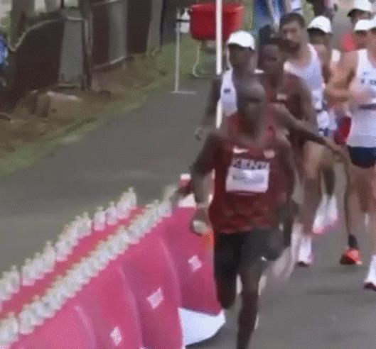 프랑스 마라토너 모하드 암도우니가 워터스테이션에 놓은 물병을 모두 쓰러뜨린 뒤 마지막에 남은 하나를 가져갔다. (벤 세인트 로런스 트위터 갈무리) © 뉴스1 |