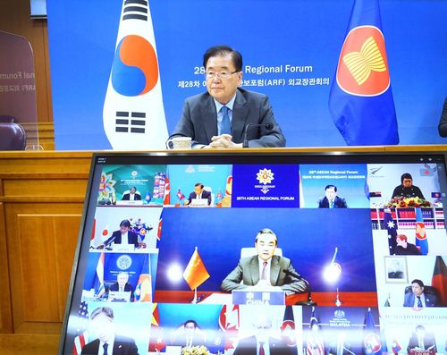(서울=연합뉴스) 정의용 외교부 장관이 2021년 8월 6일 화상으로 진행된 아세안지역안보포럼(ARF) 외교장관회의에 참석하고 있다. 정 장관 아래 화면 중앙은 왕이(王毅) 중국 외교담당 국무위원 겸 외교부장. 2021.8.9 [외교부 제공, 재판매 및 DB 금지] |