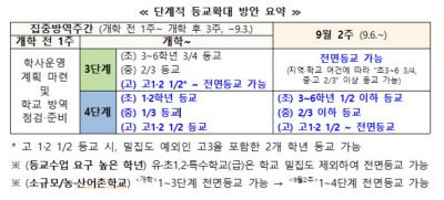 집중방역기간이 지난 다음달 6일부터는 등교가 더욱 확대된다. 3단계에서는 모든 학교의 전면 등교가 가능하며 4단계에서도 학교별로 3분의 2까지 등교할 수 있게 된다. 4단계에서 초등학교 1·2학년은 매일 등교하고 3∼6학년도 2분의 1까지 등교할 수 있다. 중학교도 3분의 2 이하까지 등교할 수 있다. 고등학교의 경우 고3은 매일 등교하고 1·2학년은 2분의 1까지 등교하거나 전면 등교도 가능하다.