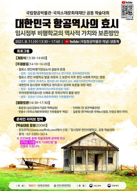 ▲ 국립항공박물관은 이달 11일 오후 1시 30분 국외소재문화재재단과 함께 '대한민국 항공역사의 효시, 임시정부 비행학교의 역사적 가치와 보존방안'을 주제로 학술대회를 연다고 9일 밝혔다. 양 기관은 또 이날 국외 소재 항공 관련 한국 근현대사 역사자료 관련 업무협약을 맺고 협력체계를 강화하기로 했다. 이번 학술대회는 신종 코로나바이러스 감염증(코로나19) 방역지침에 따라 온라인으로 진행된다. (서울=연합뉴스)