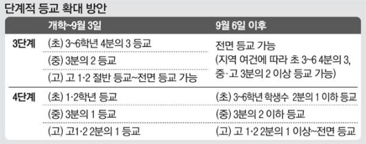 다음주 본격 시작하는 개학날부터 9월 3일까지의 집중방역 기간을 거쳐 등교일수가 당초 6월 발표했던 사회적 거리 두기 개편안보다 대폭 늘어난다. 교육부가 9일 발표한 단계적 등교 확대 방안에 따르면 먼저 9월 3일까지는 수도권 4단계가 계속되더라도 초등학교 1·2학년과 고등학교 3학년은 매일 등교한다. 중학교도 3분의 1이 등교하며 고등학교는 1·2학년이 2분의 1 등교한다. 3단계인 비수도권에서는 고등학교는 전면 등교까지 가능하고 중학교는 3분의 2 등교까지 가능하다. 초등학교 3~6학년 역시 4분의 3의 밀집도를 준수하는 선에서 등교가 가능하다.