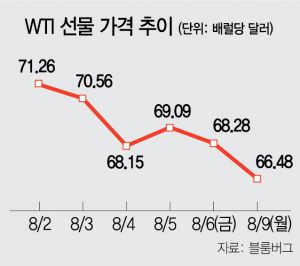 9일(현지 시간) 뉴욕상업거래소에서 9월물 서부텍사스산원유(WTI) 가격은 직전 거래일보다 2.64% 떨어진 배럴당 66.48달러를 나타냈다. 지난 5월 말 이후 최저치다. WTI 가격은 장중 4.5% 하락해 배럴당 65.15달러를 기록하기도 했다.