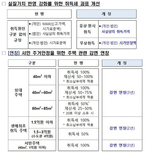 취득세 과표 개선·주택관련 감면 연장 등 지방세입 관계법률 개정안 내용 |