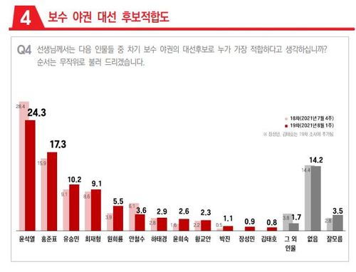 아시아경제가 윈지코리아컨설팅에 의뢰해 지난 7∼8일 전국 성인 1천6명을 조사한 결과, 보수야권 후보 적합도에서 윤 전 총장은 24.3%로 1위였다.