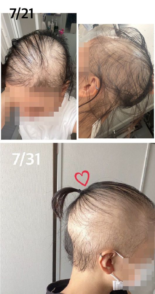 매일 배수구에 가득 찬 머리카락을 치우던 A씨는 지난달 7일 이전보다 2~3배 많은 양의 머리카락이 빠진 것을 확인하고 병원에 방문했다고 한다. 이날 찍은 사진 속 A씨 두피 곳곳에는 원형 탈모 흔적이 보인다. 지난달 14일부터는 가발을 쓰고 출근했다고 한다. 당시 두피 상태 사진을 공개한 A씨는 “상당히 지저분한 사진이라 죄송하다”고 덧붙이기도 했다. 사진 속에는 머리카락 일부분이 통째로 빠져 두피가 일자로 드러난 모습이었다.