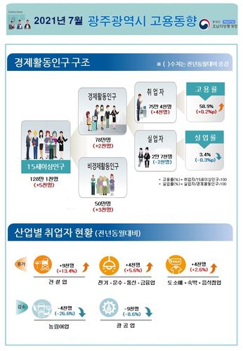 호남지방통계청이 11일 발표한 7월 지역 고용동향에 따르면 광주지역 취업자는 75만4천명으로 지난해 같은 기간보다 4천명 증가했다.