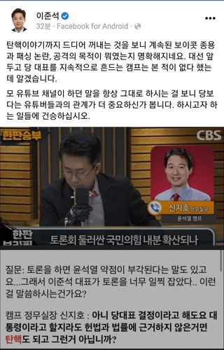 그는 "대선을 앞두고 당대표를 지속적으로 흔드는 캠프는 본 적이 없다고 했는데 알겠다"라며 "모 유튜브 채널이 하던 말을 항상 그대로 하고 있다. 당보다 유튜버들과의 관계가 더 중요한가"라고 물었다.