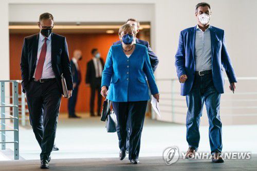 앙겔라 메르켈 독일 총리(가운데)와 미하엘 뮐러 베를린시장(왼쪽), 마르쿠스 죄더 바이에른주총리(오른쪽)[EPA=연합뉴스] |