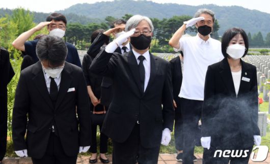 (대전=뉴스1) 김기태 기자 = 최재형 전 감사원장이 지난달 12일 오전 대전 유성구 현충원로 국립대전현충원을 찾아 천안함 전사자 묘역을 참배하고 있다. 2021.7.12/뉴스1 |