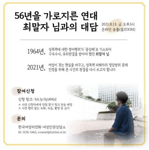 (서울=연합뉴스) 김기훈 기자 = 한국여성의전화는 13일 오후 3시 '56년을 가로지른 연대, 최말자 님과의 대담'을 온라인으로 진행한다고 밝혔다.