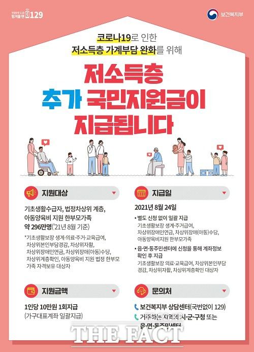 이번 저소득층 대상 추가 국민지원금은 중위소득 88% 이하인 국민에게 지원하는 제5차 재난지원금과는 별도로 기초생활수급자와 법정 차상위계층, 아동양육비를 지원받는 법정 한부모가족 등 저소득층 8221여 명에게 현금으로 지급한다.
