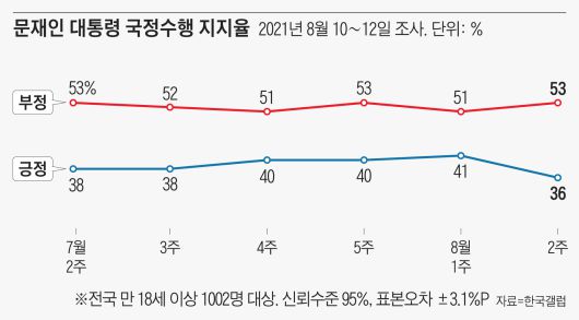 한국갤럽이 지난 10∼12일 전국 만 18세 이상 1002명을 대상으로 조사한 결과, ‘문 대통령이 직무를 잘 수행하고 있다’는 응답은 36%로 나타났다. 문 대통령의 지지도가 30%대를 기록한 것은 7월 3주차(38%) 이후로 한 달 만이다.