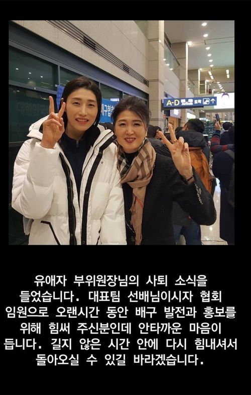 김연경은 13일 자신의 사회관계망 서비스에 유 부위원장과 함께 찍은 사진과 함께 “유애자 부위원장님의 사퇴소식을 들었습니다. 대표팀 선배님이시자 협회 임원으로 오랜 시간 동안 배구 발전과 홍보를 위해 힘써주신 분인데 안타까운 마음이 듭니다"라는 글을 올렸다.
