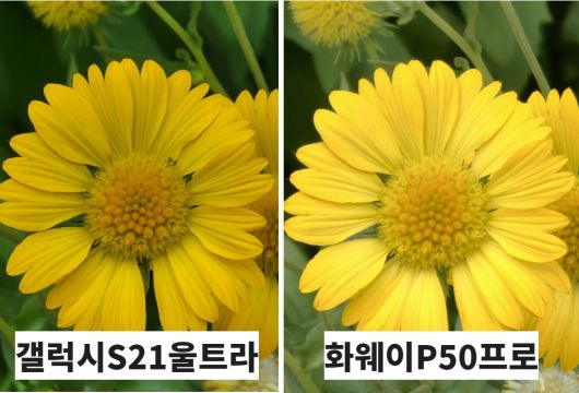 그렇다면 두 기기의 촬영 결과물을 직접 비교한 결과는 어떨까. 일단 이용자들은 갤럭시S21 울트라의 결과물이 더 양질이라는 평가를 내놓고 있다. 특히 고배율로 확대 촬영할 때 성능 우위가 확연하게 드러난다. 아이스유니버스가 각 기기를 이용해 10배줌 촬영한 사진을 살펴보면, P50 프로로 촬영한 사진에선 나뭇잎이나 열매 표면 등 세부 디테일이 다소 뭉개져 있음을 알 수 있다.