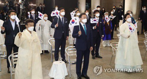 문 대통령 부부는 '길이 보전하세'라는 문구가 새겨진 마스크를 낀 채 행사에 임했고 광복절 노래가 나올 때에는 태극기를 흔들기도 했다.
