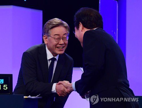 더불어민주당 이재명(왼쪽), 이낙연 대선 예비후보가 8월 11일 오후 서울 여의도 KBS에서 열린 본경선 3차 TV토론에 앞서 인사하고 있다. [연합뉴스 자료사진] |