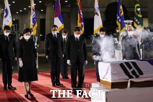 문재인 대통령과 김정숙 여사가 15일 오후 일제강점기 봉오동 전투 승리를 이끈 홍범도 장군의 유해 봉환식이 열린 서울공항에서 홍 장군의 유해에 분향 및 묵념하고 있다. /뉴시스 |