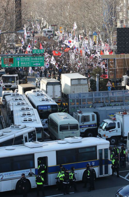 박근혜 대통령 탄핵심판 선고일이었던 2017년 3월 10일 서울 종로구 재동 헌법재판소 인근의 모습. 경찰이 세운 차벽 밖에서 보수단체 회원들이 탄핵 기각 촉구 집회를 열었다./연합뉴스 |