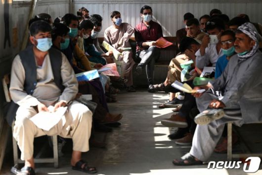 (카불 AFP=뉴스1) 이정후 기자 = 25일(현지시간) 아프가니스탄 수도 카불에서 여권을 신청하려는 시민들이 대기실에 모여있다. 아프가니스탄 내 미군 철수 결정으로 탈레반이 세력을 확장하면서 최근 아프가니스탄을 떠나려는 사람들이 증가하고 있다. (C) AFP=뉴스1 |