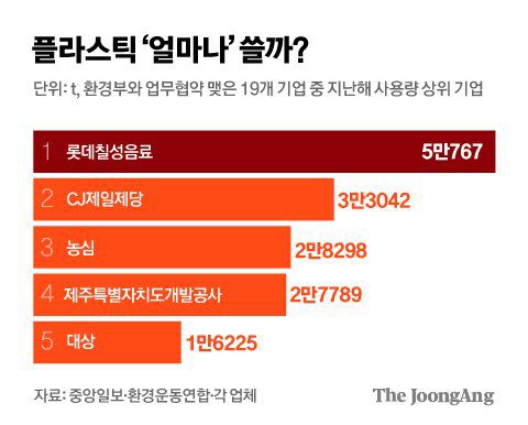 질문 대상은 플라스틱 사용이 많은 기업이다. 환경부 협약 당시 이들이 생산한 페트병은 국내 전체 출고량의 55%였다. 한 해에 수천~수만 t의 플라스틱을 사용 중이다. 답변서에 따르면 롯데칠성음료는 지난해 5만767t을 썼고, CJ제일제당 3만3042t, 농심 2만8298t, 제주특별자치도개발공사 2만7789t 순이었다.