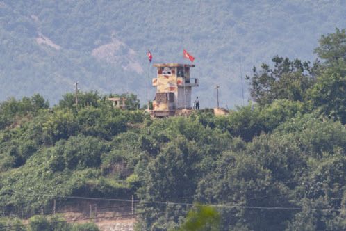 한미 군 당국이 후반기 연합지휘소훈련을 시작한 16일 경기도 파주시 접경지역에서 바라본 임진강변 북측에서 북한군이 초소 근처를 이동하고 있다(사진=연합뉴스). |