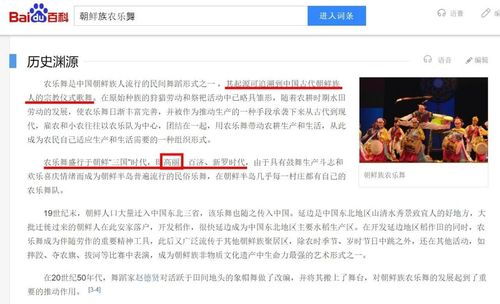 이 단어를 검색하면 '농악무'로 자동 변환되는가 하면 기원 설명에서는 "농악무는 중국 조선족 사람들 사이에서 유행하는 민간 무용 형식 중 하나로, 기원은 중국 옛 조선족 종교의식 가무로 거슬러 올라간다"며 "수렵과 채집 시기에서 농경사회로 넘어오며 원시 종족부터 존재했고, 이는 조선족의 역사와 전통이 있는 문화"라고 왜곡하고 있다.