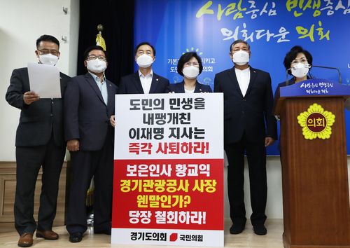(수원=연합뉴스) 이우성 기자 = 경기도의회 국민의힘은 17일 이재명 경기지사의 '전 도민 재난지원금 지급' 방침과 경기관광공사 사장 내정 논란과 관련해 "표심을 의식한 선심성 예산 집행과 보은성 인사권 행사를 즉각 철회하고 '지사 찬스' 사용을 중단하라"고 촉구했다.