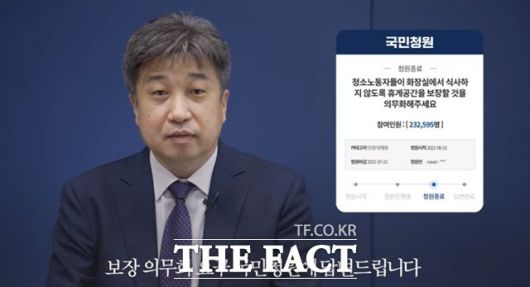 앞서 지난 6월 21일 한 청원인은 '청소노동자들이 화장실에서 식사하지 않도록 휴게공간을 보장할 것을 의무화해주세요'라는 제목의 청원을 통해 "생명 활동에 필수적인 식사와 용변은 기계가 아닌 인간으로서 기본적인 권리"라며 "청소노동자들이 '화장실'에서 식사하지 않도록 휴게공간을 실질적으로 보장할 것을 의무화해 달라"고 요청했다. 이 청원은 국민 23만2595명의 동의를 얻어 청와대의 답변 요건을 충족했다.