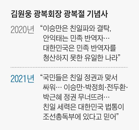 김 회장은 이날 YTN라디오 ‘황보선의 출발 새아침’에 출연, 역대 보수 정부를 ‘친일 정권’으로 규정하며 이승만·박정희 전 대통령을 친일파로 지목했던 광복절 기념사와 관련, “친일·반민족 권력을 부정한 것이지 대한민국의 정통성을 오히려 강조한 것”이라며 “그럼 대한민국의 정통성이 일제 조선총독부에 있느냐, 미군에 있느냐”고 했다. 이어 “친일을 비호하거나 이런 사람들은 오히려 그것이 위헌 세력, 위헌 정당일 수 있다”고 했다.