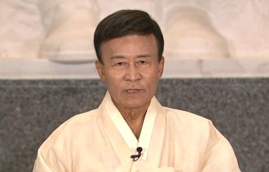 김원웅 광복회장이 15일 오전 옛 서울역사(문화역서울 284)에서 열린 제76주년 광복절 경축식에서 사전에 녹화된 기념사를 하고 있다. /KTV |