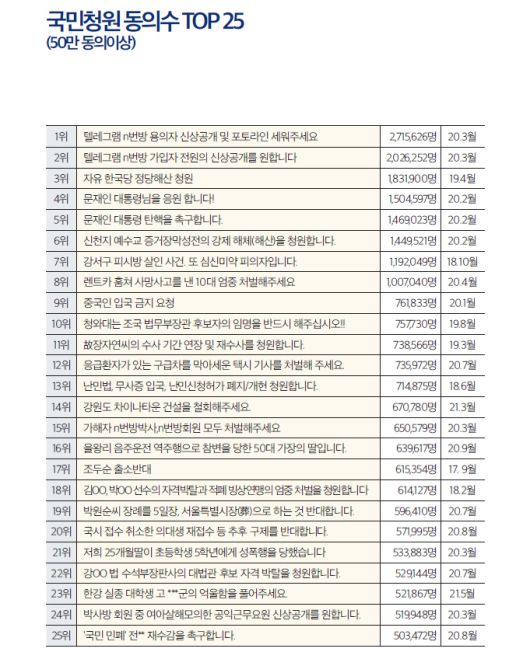 가장 많은 동의를 받은 청원 1·2위는 모두 지난해 3월 게시된 텔레그램 n번방 용의자 신상공개 등 요구 청원이었다. 각각 271만여명과 202만여명의 동의를 얻었다. 3위는 자유한국당(국민의힘 전신) 정당해산 청원(183만여명, 2019년 4월), 4위와 5위는 각각 문재인 대통령 응원(150만여명, 2020년 2월)과 탄핵 촉구(146만여명, 2020년 2월) 청원이었다.
