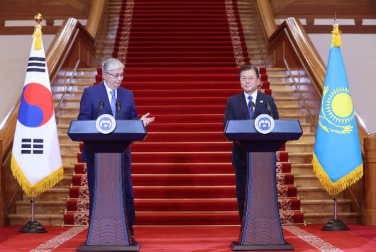 문재인 대통령이 17일 청와대에서 한-카자흐스탄 정상회담을 마치고 토카예프 카자흐스탄 대통령과 공동언론발표 행사에 참석하고 있다. 연합뉴스문재인 대통령은 국빈 방한 중인 카심-조마르트 토카예프 대통령과 17일 청와대에서 정상회담을 갖고 양국의 전략적 동반자 관계를 심화·확대해 나가는 공동성명을 채택했다.