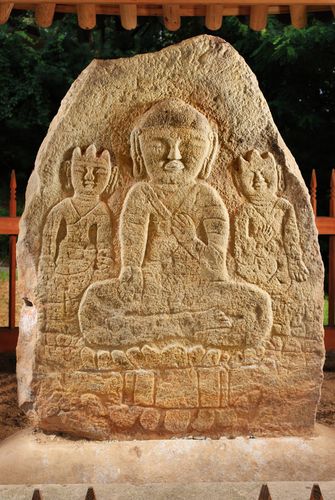 고려중기에 만든 것으로 추정되며 보존상의 높이는 113㎝, 좌우 보살의 높이는 90∼92㎝다. 바위에 형상이 새겨진 부조(浮彫)형이다.