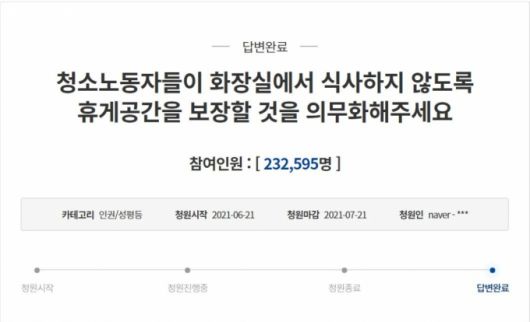 지난 6월 청와대 국민청원 게시판에는 '청소노동자들이 화장실에서 식사하지 않도록 휴게공간을 보장할 것을 의무화해주세요'라는 제목의 청원이 올라왔다. 적절한 휴게시설이 없어 화장실에서 식사하는 열악한 청소노동자의 노동 환경을 지적하며 냉난방과 환기, 편의시설을 보장한 실질적 휴게공간 의무화 등을 요구했다. 해당 글은 한 달간 23만2595명이 동의해 답변 기준을 충족했다.