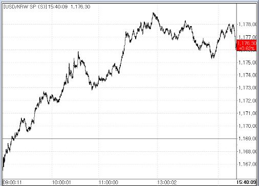 17일 서울외국환중개에 따르면 원·달러 환율은 전 거래일 종가보다 7.30원 오른 1176.30원에 마감했다. 장중 한때는 1179.00원까지 오르면서 1180원을 목전에 두고 장을 마쳤다. 이는 장중 고점 기준으로 9월 16일(1181.50원 이후) 약 11개월 만이다. 종가 기준으로는 9월 15일 1179.00원 이후 최고치로, 지난주 마지막 거래일인 13일 종가인 1169.00원보다 7원 가량 더 오른 수준이다. 다만 오후 장중 외환 당국의 스무딩 오퍼레이션(미세조정)으로 추정되는 움직임이 나왔고 외국인 투자자가 매도 규모를 지난주보다 줄이면서 상승폭을 일부 반납했다.